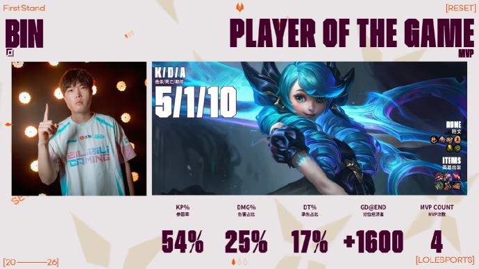 北京时间3月22日,2026全球先锋赛决赛,第二局Bin格温发育得非常好接管团战,BLG扳回一局1-1战平G2。