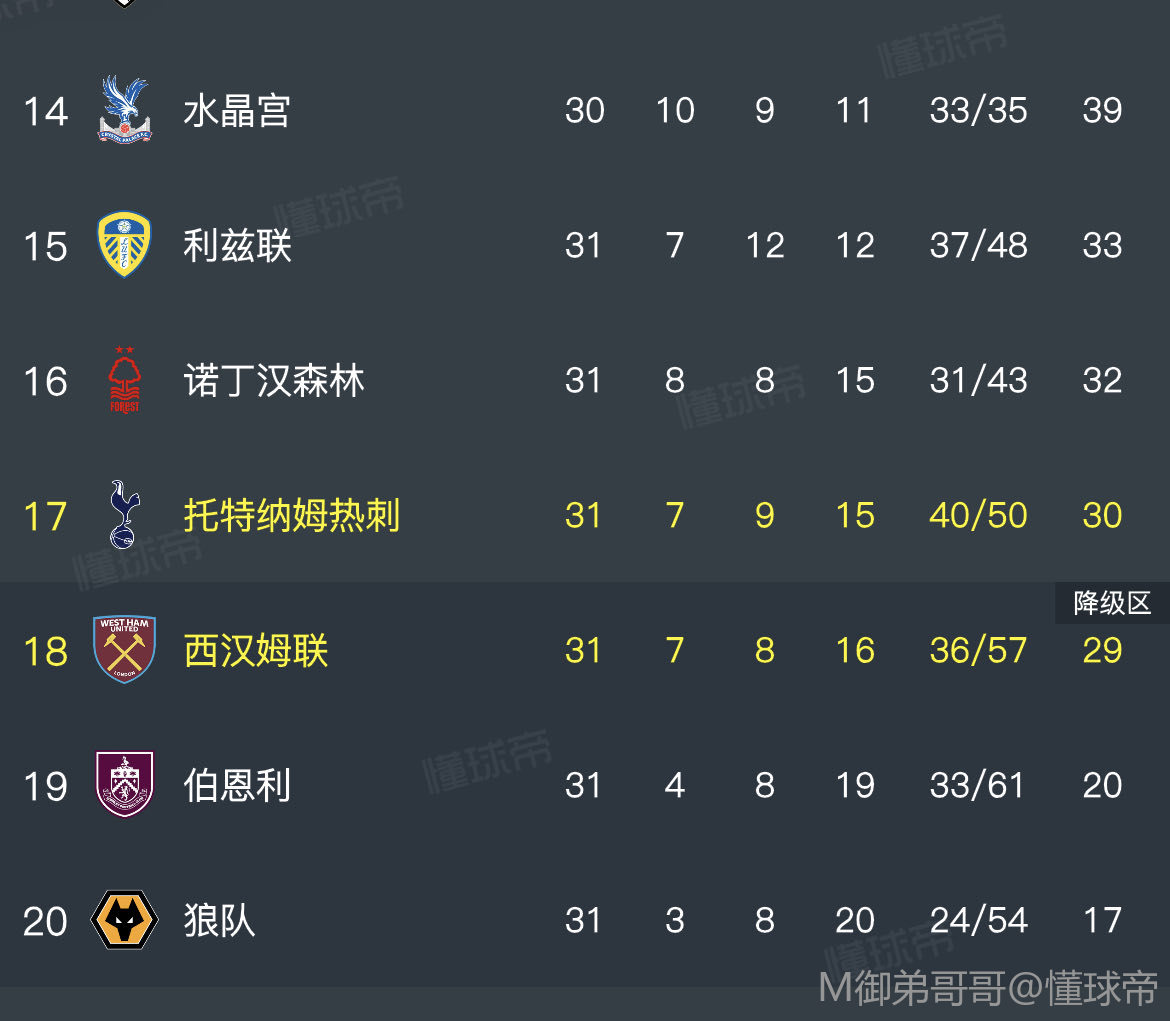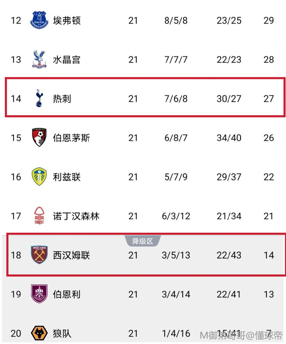保级主动权还在?热刺领先降级区1分,而净胜球领先铁锤11个