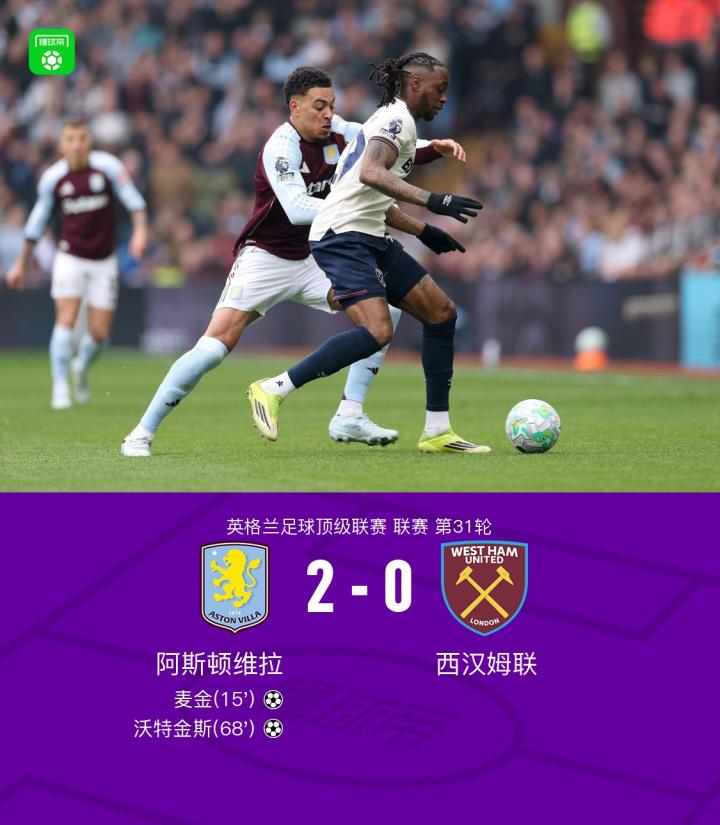 扫描下载懂球帝首页>动态> 维拉2-0西汉姆联,麦金破门,沃特金斯进球