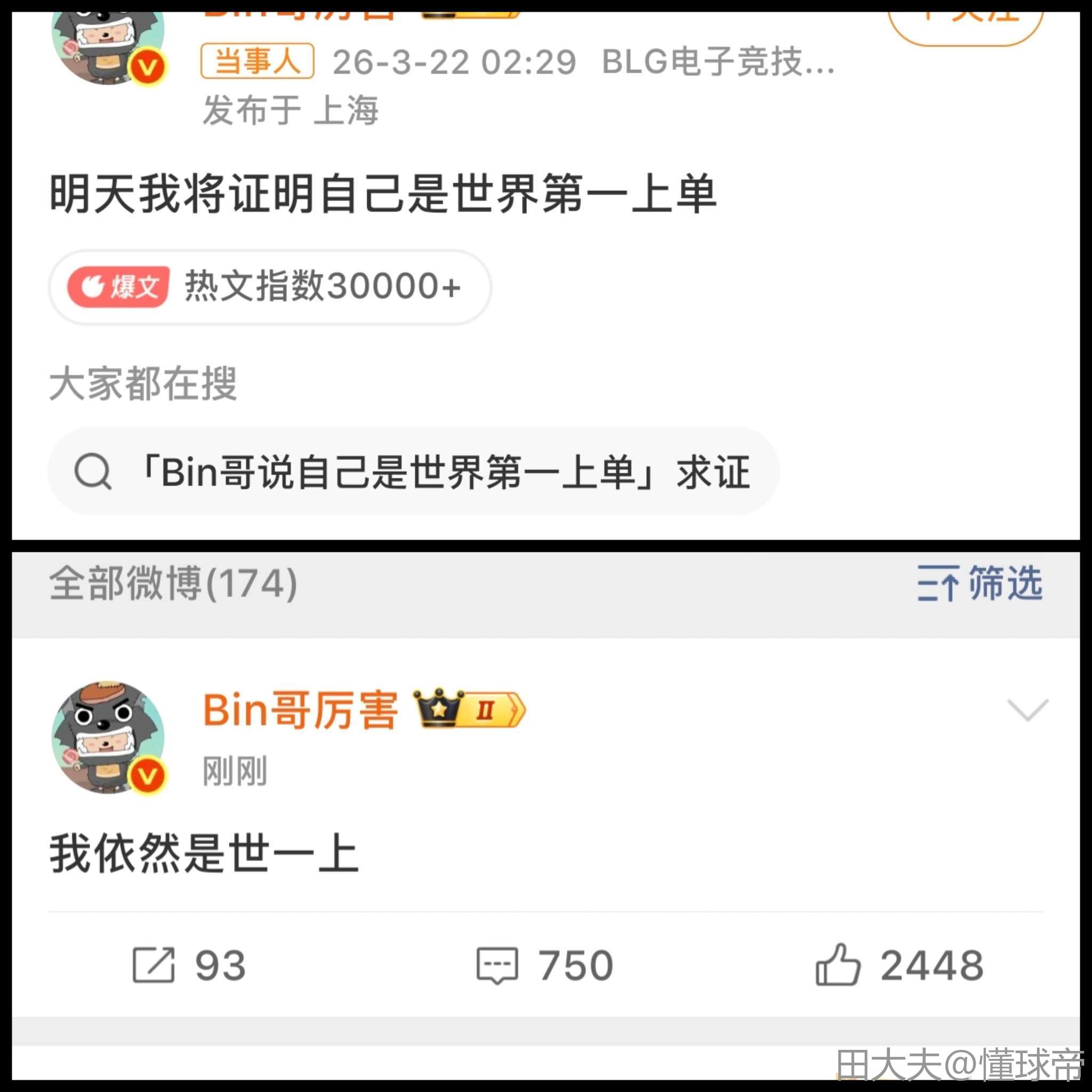 虽然自从bin去blg精神状态越来越奇怪后我对他是真无语😑加恶心🤢,我也想不明白他咋能去blg几年就成这样了,和在SN,RNG完全不一样。但今天确实够C,没他真就赢不了。