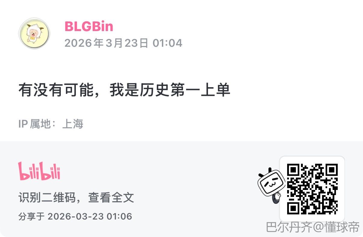 北京时间3月23日,BLG在2026英雄联盟全球先锋赛决赛中3-1击败G2夺冠。在夺得冠军、当选FMVP后,Bin光速发文:我依然是世一上。