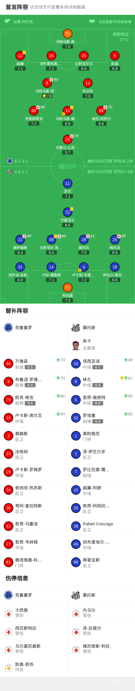 北京时间3月23日巴西足球甲级联赛第8轮,克鲁塞罗主场对阵桑托斯。下半场补时阶段,巴雷亚尔低射破门,最后被吹越位无效。最终比分克鲁塞罗 0-0 桑托斯。