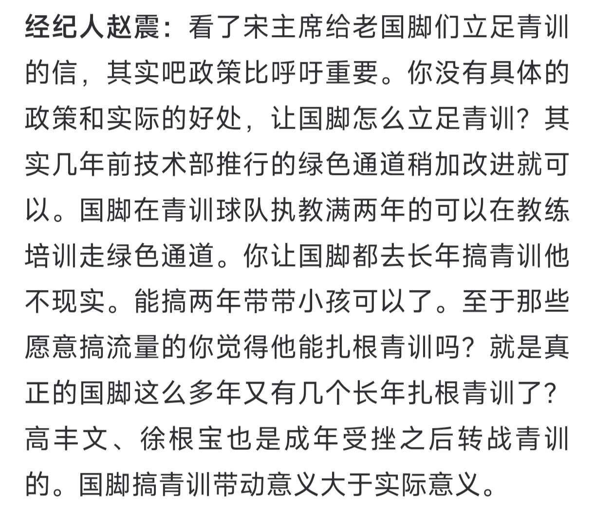 认真搞青训一定是没有问题的大方向,现在的关键问题是,真的都在落实吗?我看到有的球队还让30多岁的半退役老将去踢青年队踢得中乙,占用年轻人出场机会,违背原则