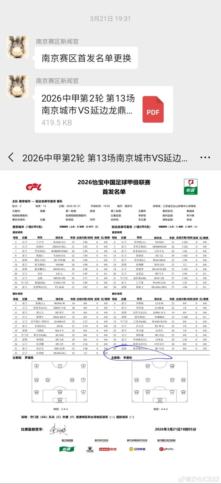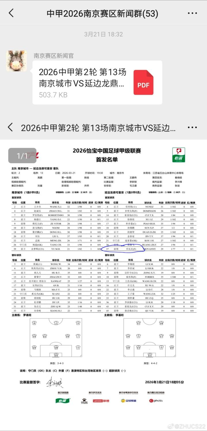南京城市对阵延边龙鼎的比赛,早在赛前两天,延边队抵达南京赛区时,赛区就提出了公安需要检查外援、外教的相关出入境和工作签证材料,但延边方面一直以“所有外援材料齐全”、“踩场时给到”、“早上联席会给到”、“傍晚到场地时给到”进行拖延,直至赛前,此时,延边已经提交了包括37号乔瓦尼在内的首发名单(附图1-18点32分的第一份首发名单)。在球员进场前,由于延边方面仍未提供相关材料,有关部门再次强调了按照出入境管理处的要求,必须进行材料检查,没有工作类居留许可,不能进行工作,否则将进行行政处罚。于是,在中足联选派的当值比赛监督要求下,延边方面撤下了37号乔瓦尼的首发,将其移出了比赛大名单(附图2-19点31分的第二份首发名单)。之后,上半场开场后,双方仍在斡旋此事,因为球员本身在中足联的竞赛系统中是具备出场资格的,于是在延边方面的要求下,37号乔瓦尼又被报进了替补席。(附图3-19点48分的第三份首发名单)。