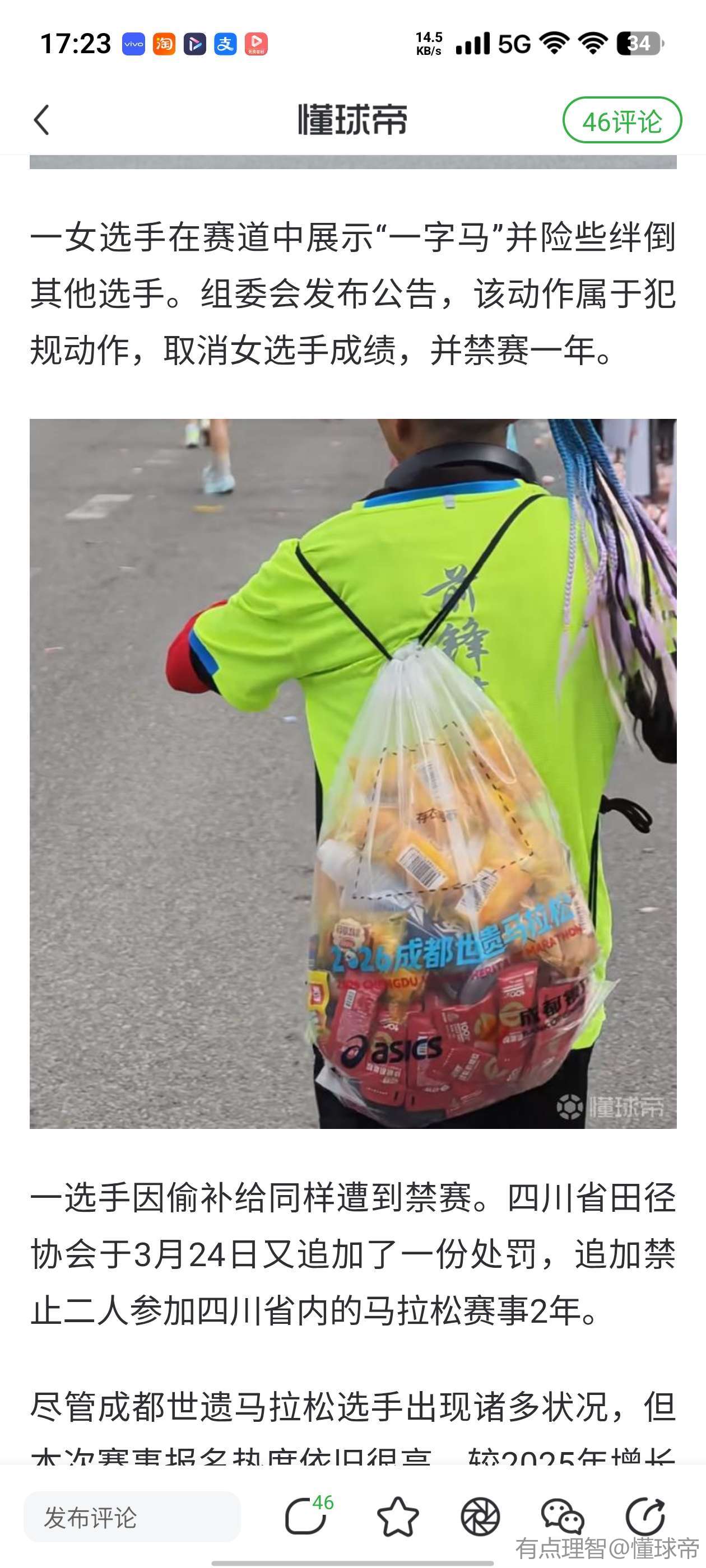 一选手因偷补给同样遭到禁赛。四川省田径协会于3月24日又追加了一份处罚,追加禁止二人参加四川省内的马拉松赛事2年。