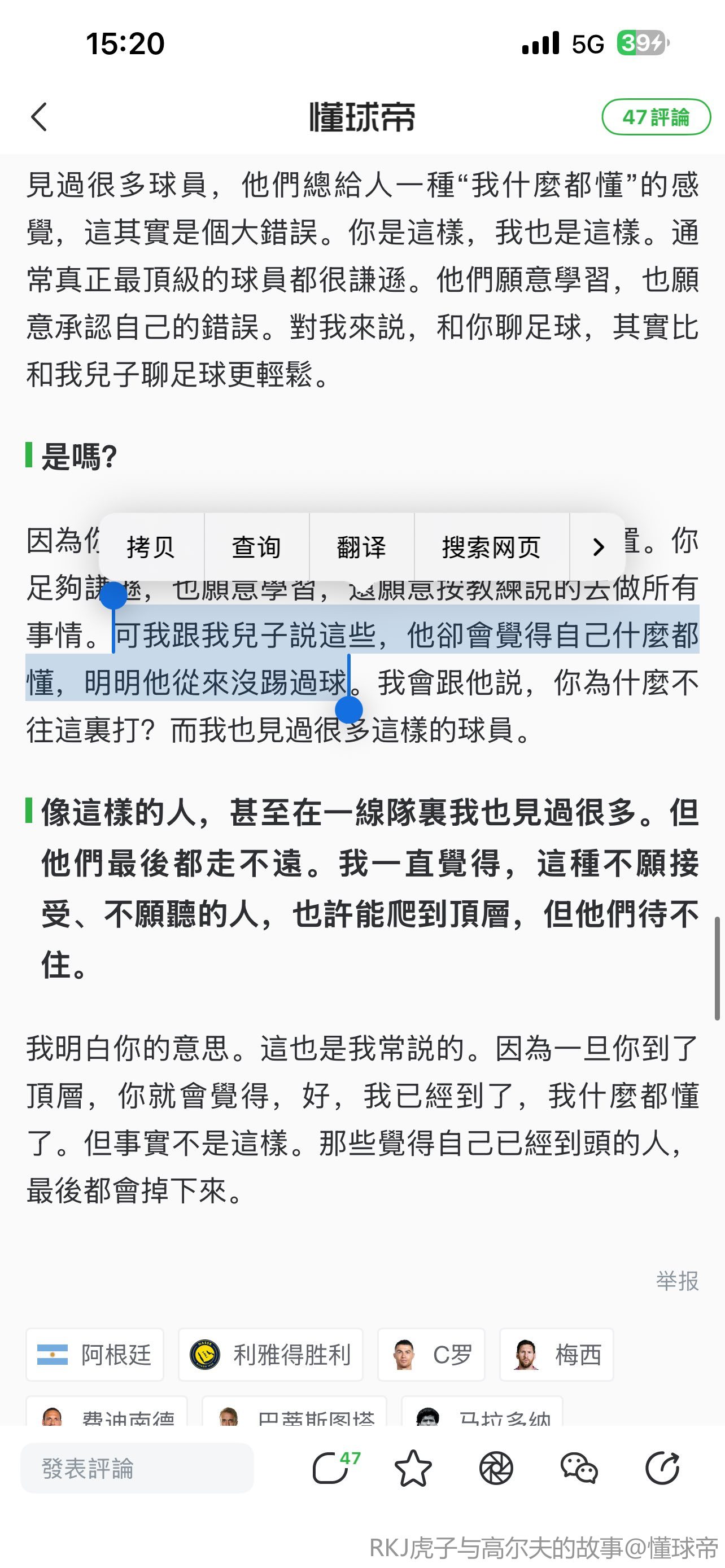 这很有意思,因为我看到过你的一句话,大意是:哪怕梅西在技术上同样出色,甚至更强,他也无法超越马拉多纳,因为梅西没有马拉多纳那种气场。那是你说的吧?