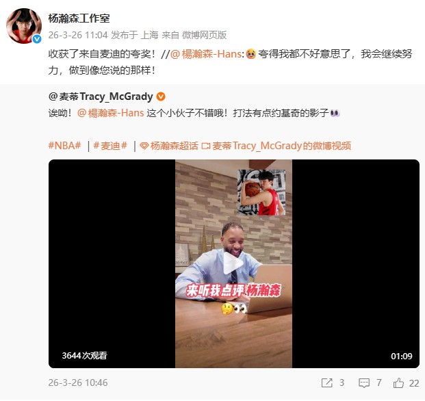 扫描下载懂球帝首页>动态> 麦迪:杨瀚森球商高注定有长期竞争力,打法让我想到约基奇