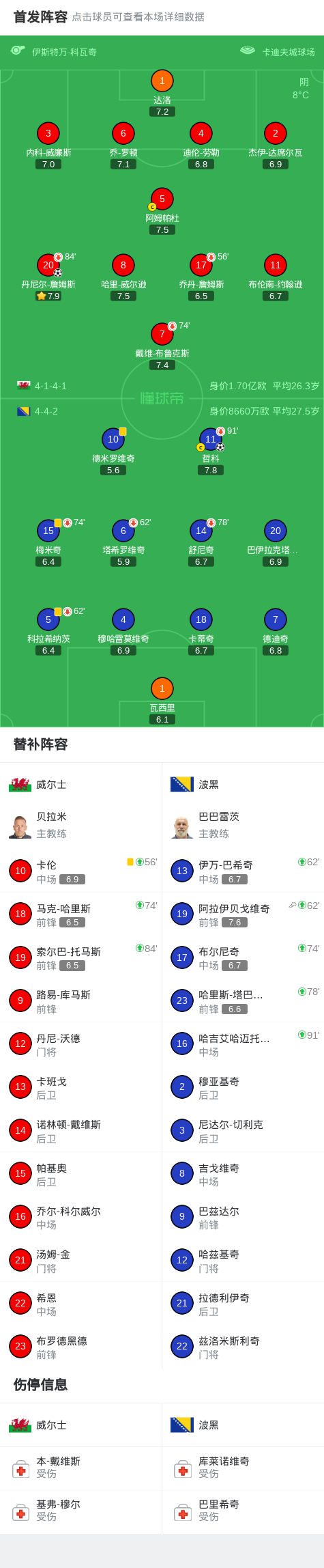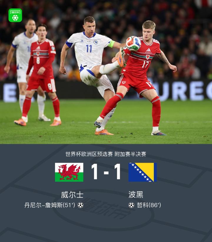 扫描下载懂球帝首页>动态> 90分钟战报:威尔士 1-1波黑,丹尼尔-詹姆斯进球,哲科扳平