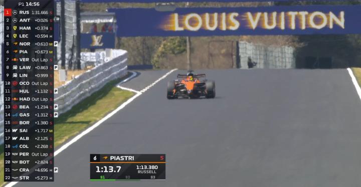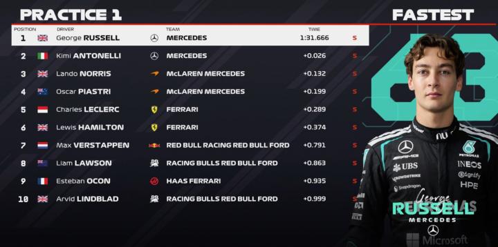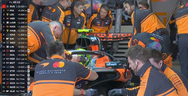 一练停表,拉塞尔全场最快,安东内利第二,迈凯伦三四,法拉利五六,维斯塔潘第七。