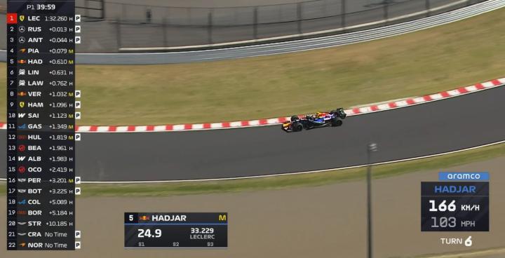 一练还剩15分钟左右,梅赛德斯、法拉利和迈凯伦在前六名整整齐齐地排列。