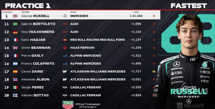 北京时间3月27日,F1日本站一练,拉塞尔全场最快,安东内利第二,迈凯伦三四,法拉利五六,维斯塔潘第七,劳森第八,奥康第九,林德布拉德第十。