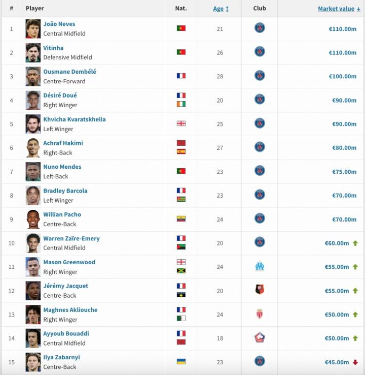 03-27 21:35法甲身价排行:内维斯、维蒂尼亚1.1亿欧元并列第一,大巴黎包揽前十