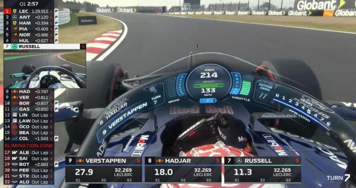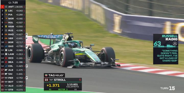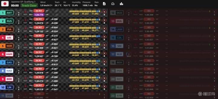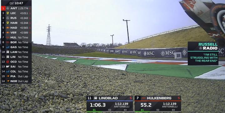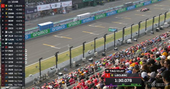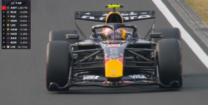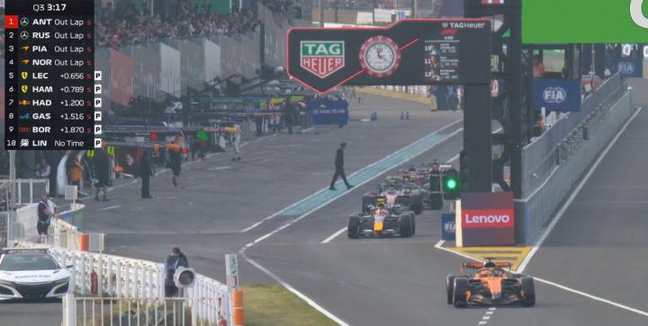 最终Q3结束,安东内利拿到杆位,拉塞尔第二,皮亚斯特里第三,勒克莱尔第四。