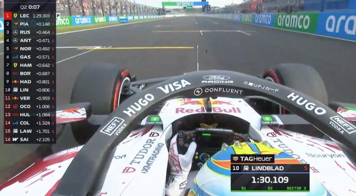 林德布拉德超越维斯塔潘来到P10,Q2淘汰车手:维斯塔潘、奥康、霍肯伯格、劳森、科拉平托、塞恩斯。