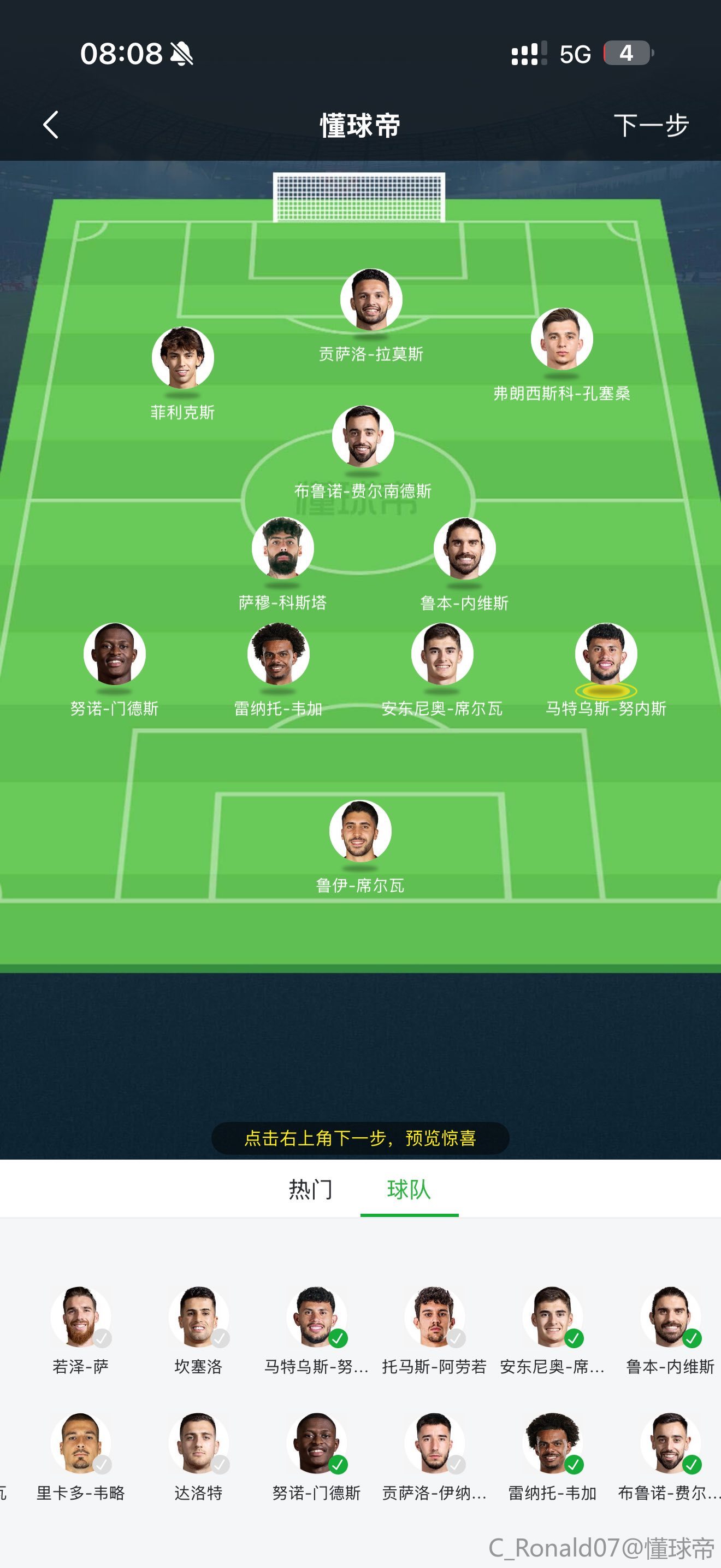 葡萄牙首发:32-鲁伊-席尔瓦、6-努内斯、4-安东尼奥-席尔瓦、43-韦加、25-努诺-门德斯、5-萨穆-科斯塔、21-鲁本-内维斯、8-布鲁诺-费尔南德斯、26-孔塞桑、10-菲利克斯、9-贡萨洛-拉莫斯