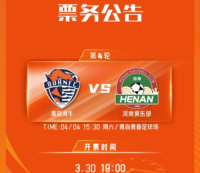 4月4日(星期六)15:30,在2026赛季中超联赛第4轮的一场关键争夺中,青岛海牛坐镇主场青岛青春足球场,迎战河南队。3月30日,青岛海牛足球俱乐部发布了这场比赛的票务公告。