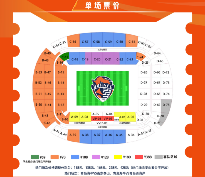 这是青岛海牛本赛季第二个主场,由于适逢清明假期首日,而且全队在努力冲击赛季首分、首胜,所以备受关注。根据公告,这场比赛的球票,从3月30日19:00正式启售,票价依然分为6个档次,分别为:388、180、128、108、78、59。其中,59是学生看台,只在非热门场次开放。球迷可以通过“海牛GO”“看个比赛”“青潮文体”等途径购票。
