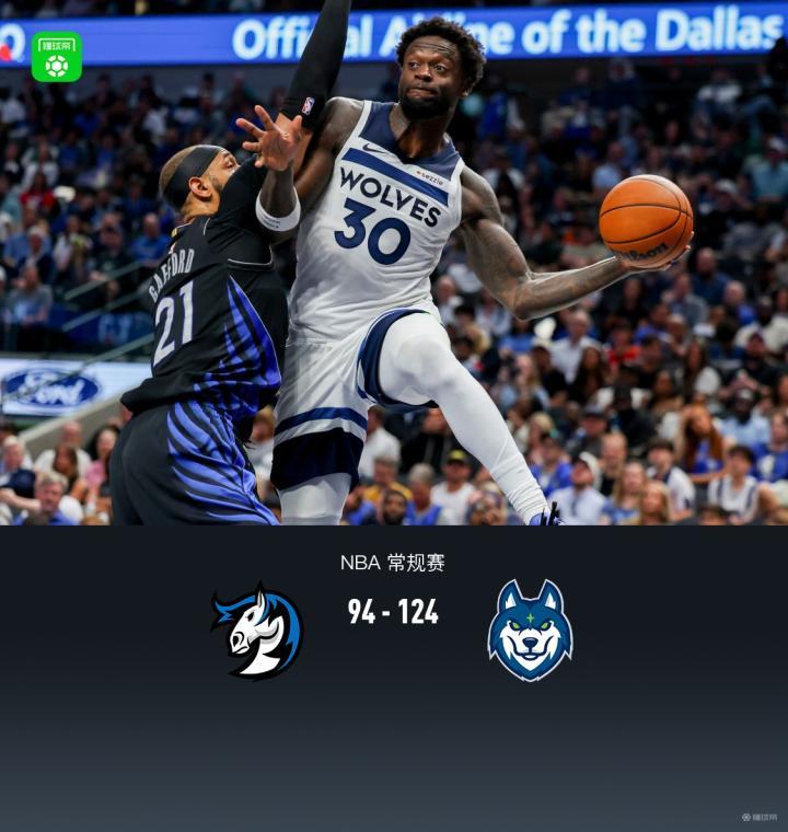 第四节独行侠约翰-波拉基达斯拿下8分,森林狼纳兹-里德拿下7分,最终独行侠94-124不敌森林狼