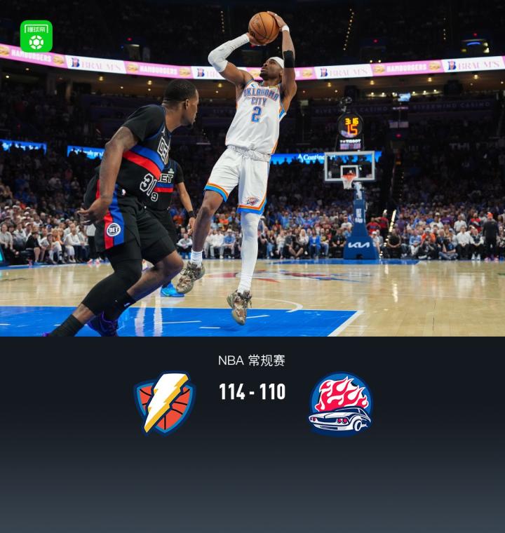 加时赛雷霆亚历山大拿下8分,活塞保罗-里德拿下4分,最终雷霆114-110战胜活塞