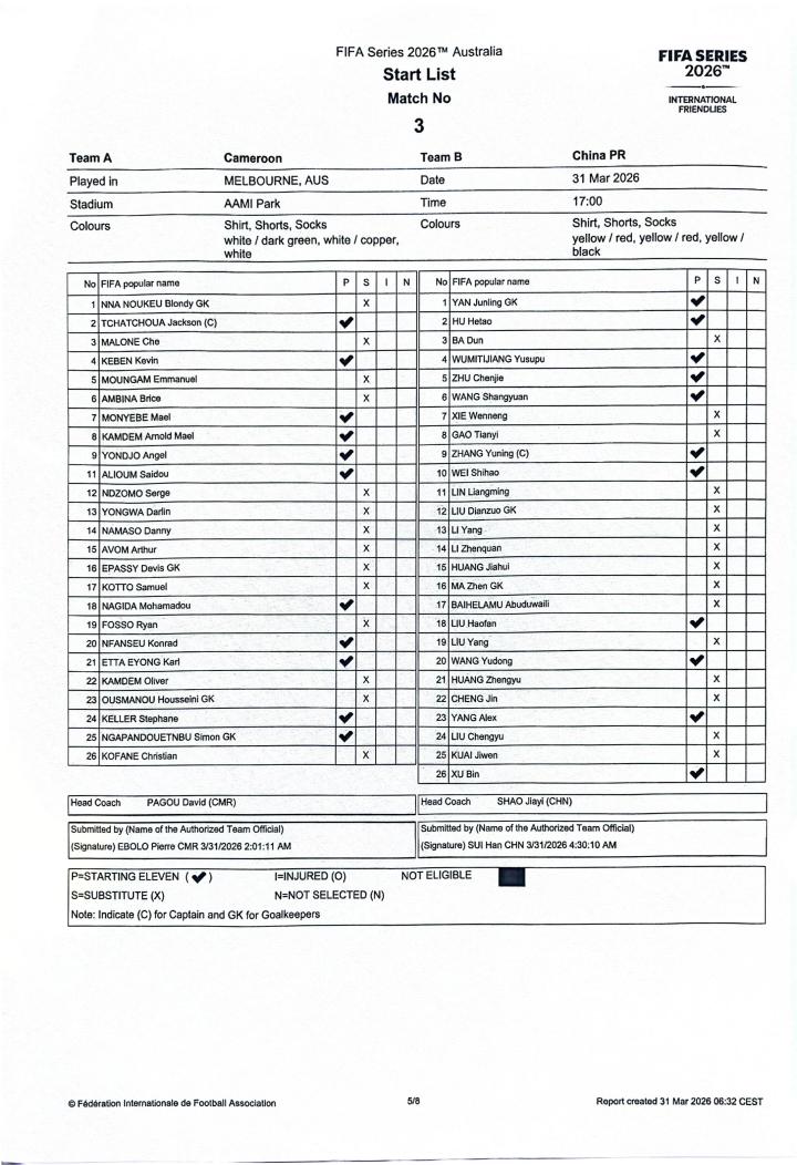 北京时间3月31日14点,中国队将对阵喀麦隆队,赛前双方首发已出炉,值得一提的是,本场喀麦隆的首发十一人,在上一场对阵澳大利亚的比赛中全部替补。