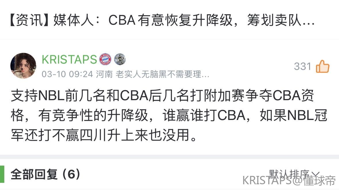支持打附加赛,谁赢谁打CBA,不支持像中超这样的升降级模式