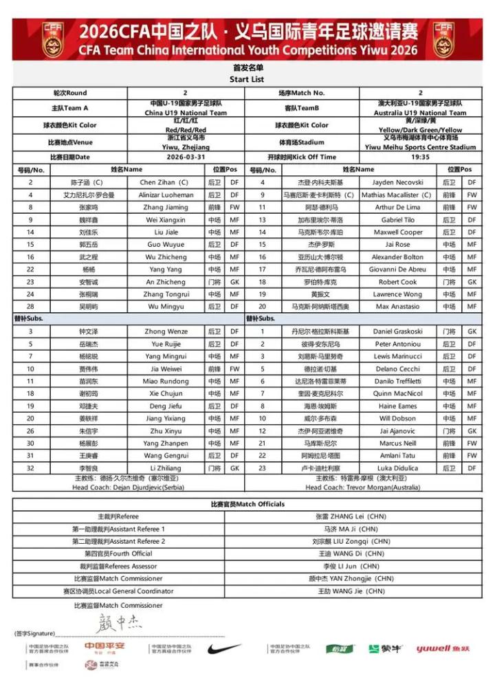 北京时间3月31日19:35,中国之队邀请赛义乌赛,中国U19再战澳大利亚U19,赛前双方首发阵容公布如下: