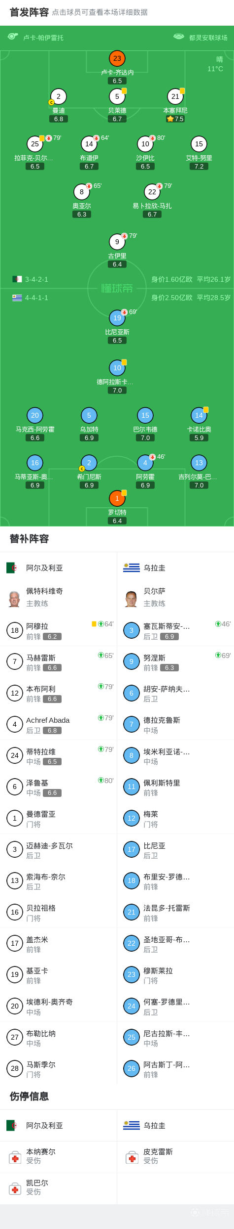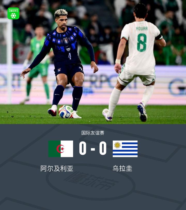 北京时间4月1日国际友谊赛,阿尔及利亚对阵乌拉圭。上半场,巴尔韦德射门被扑出。下半场,奥亚尔错失良机,两队全场比赛总共只有1次射正。全场比赛结束,阿尔及利亚0-0乌拉圭。