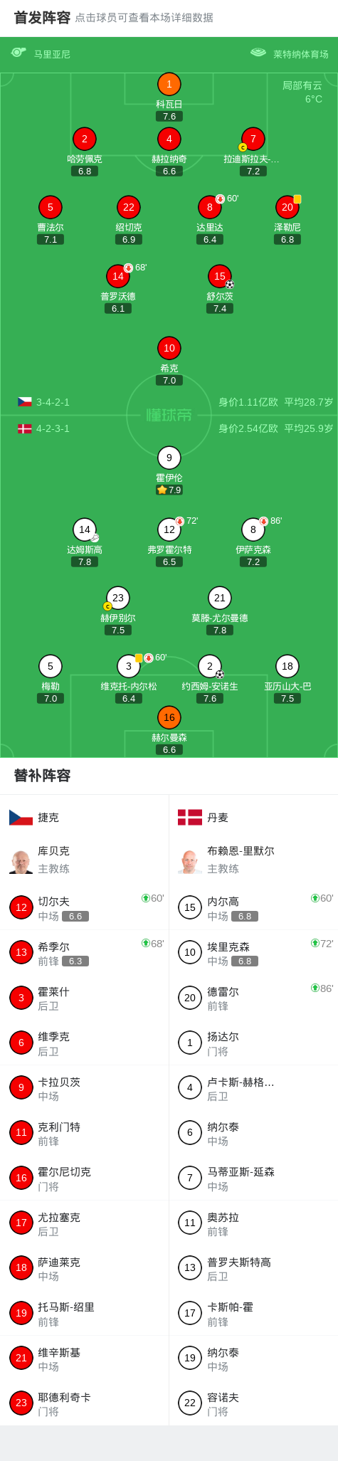 第72分钟,扳平比分!安诺生头球破门,捷克1-1丹麦