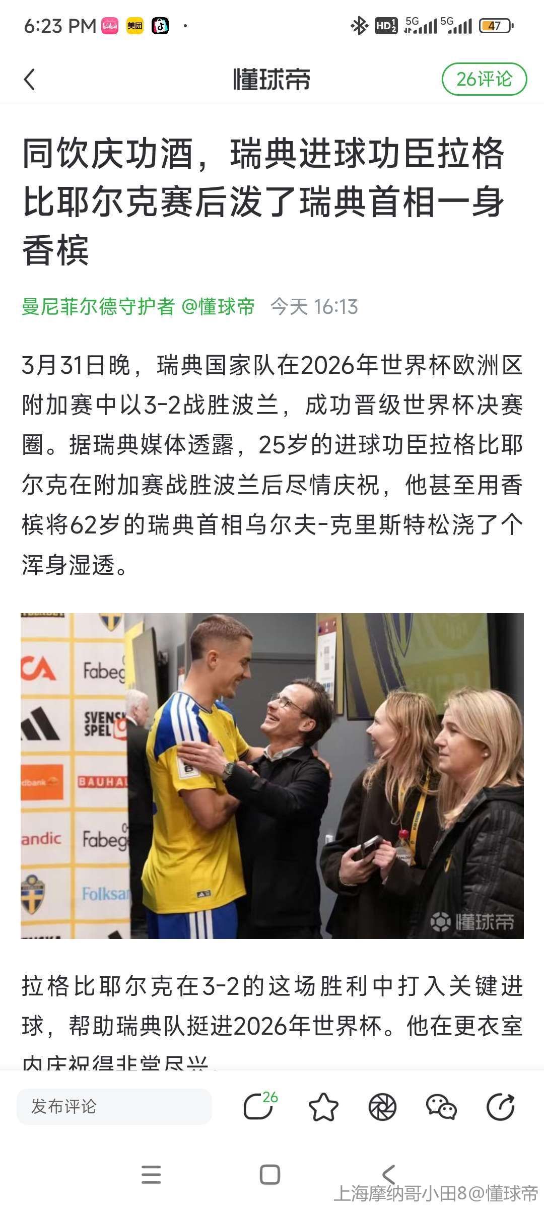 同饮庆功酒,瑞典进球功臣拉格比耶尔克赛后泼了瑞典首相一身香槟