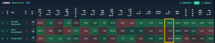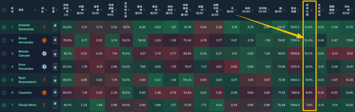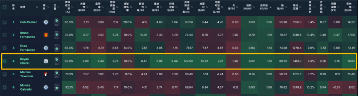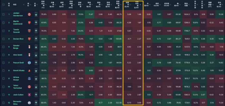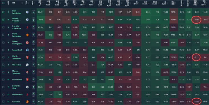 因为去掉了最后两个动作(射门&关键传球),使得这个榜单上大部分上榜的都是中场位置偏靠后的球员,恩佐、凯塞多、索博斯洛伊、苏维门迪、赖斯等。