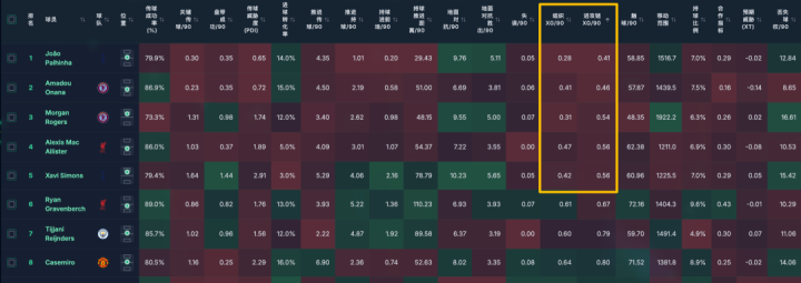 在筛选出1440分钟出场的52名球员里,无论是维尔茨还是西蒙斯,都有意地开始习惯英超的对抗和节奏,表现确实可以,但是一些“老英超”,这方面的发挥就不太行了: