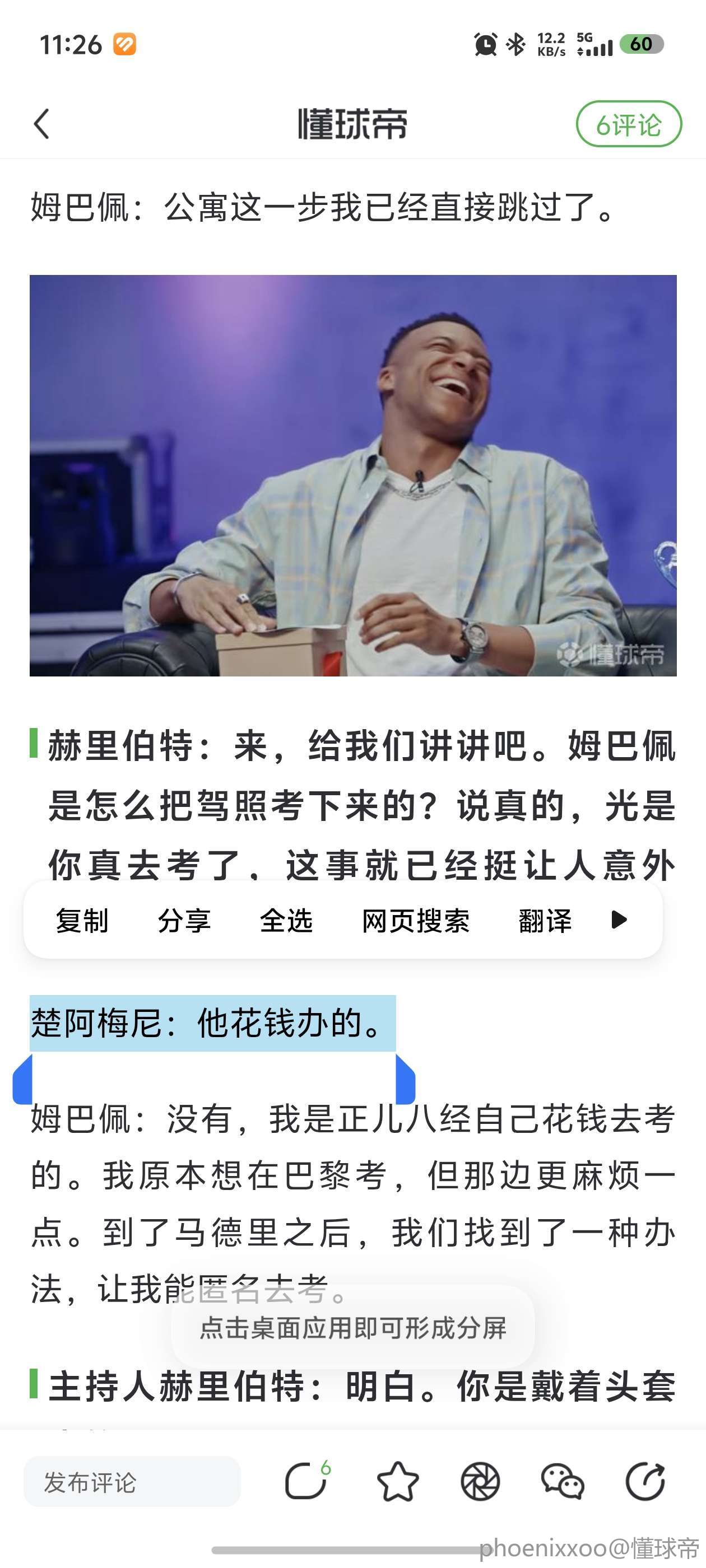 姆巴佩:没有,我是正儿八经自己花钱去考的。我原本想在巴黎考,但那边更麻烦一点。到了马德里之后,我们找到了一种办法,让我能匿名去考。