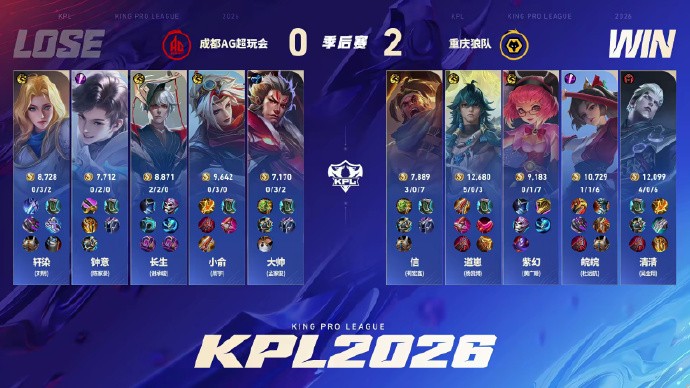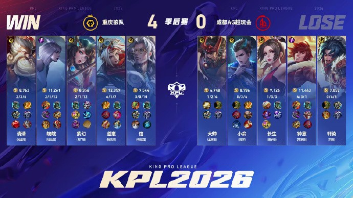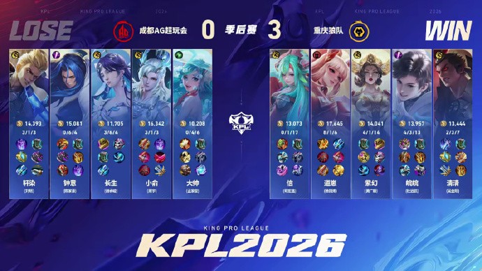 北京时间4月3日,2026KPL春季赛胜者组决赛,重庆狼队4-0横扫成都AG超玩会,成功晋级决赛!