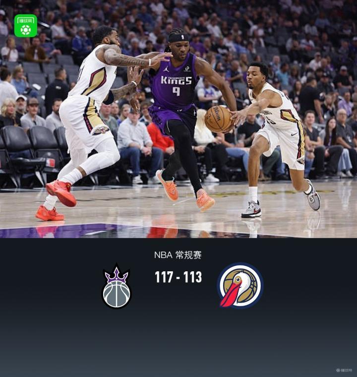 第四节国王马克西姆-雷诺拿下9分,鹈鹕费尔斯拿下8分,最终国王117-113战胜鹈鹕
