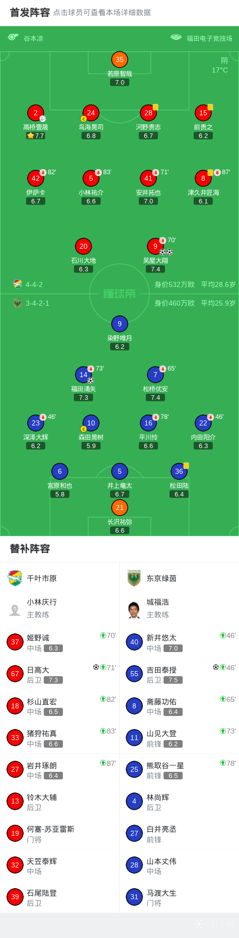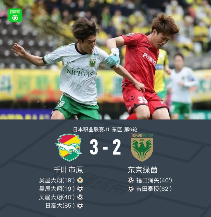 北京时间4月4日日本职业联赛J1 东区 第9轮,千叶市原主场对阵东京绿茵。千叶市原吴屋大翔梅开二度,日高大破门。东京绿茵福田涌矢破门,吉田泰授破门。最终比分千叶市原 3-2 东京绿茵。