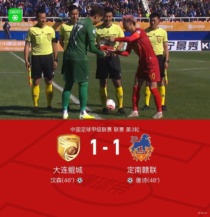 北京时间4月4日中国足球甲级联赛 联赛 第3轮,大连鲲城主场对阵定南赣联。下半场刘云助攻汉森破门,随后唐诗后点无人盯防闪电扳平。最终比分大连鲲城1-1定南赣联。