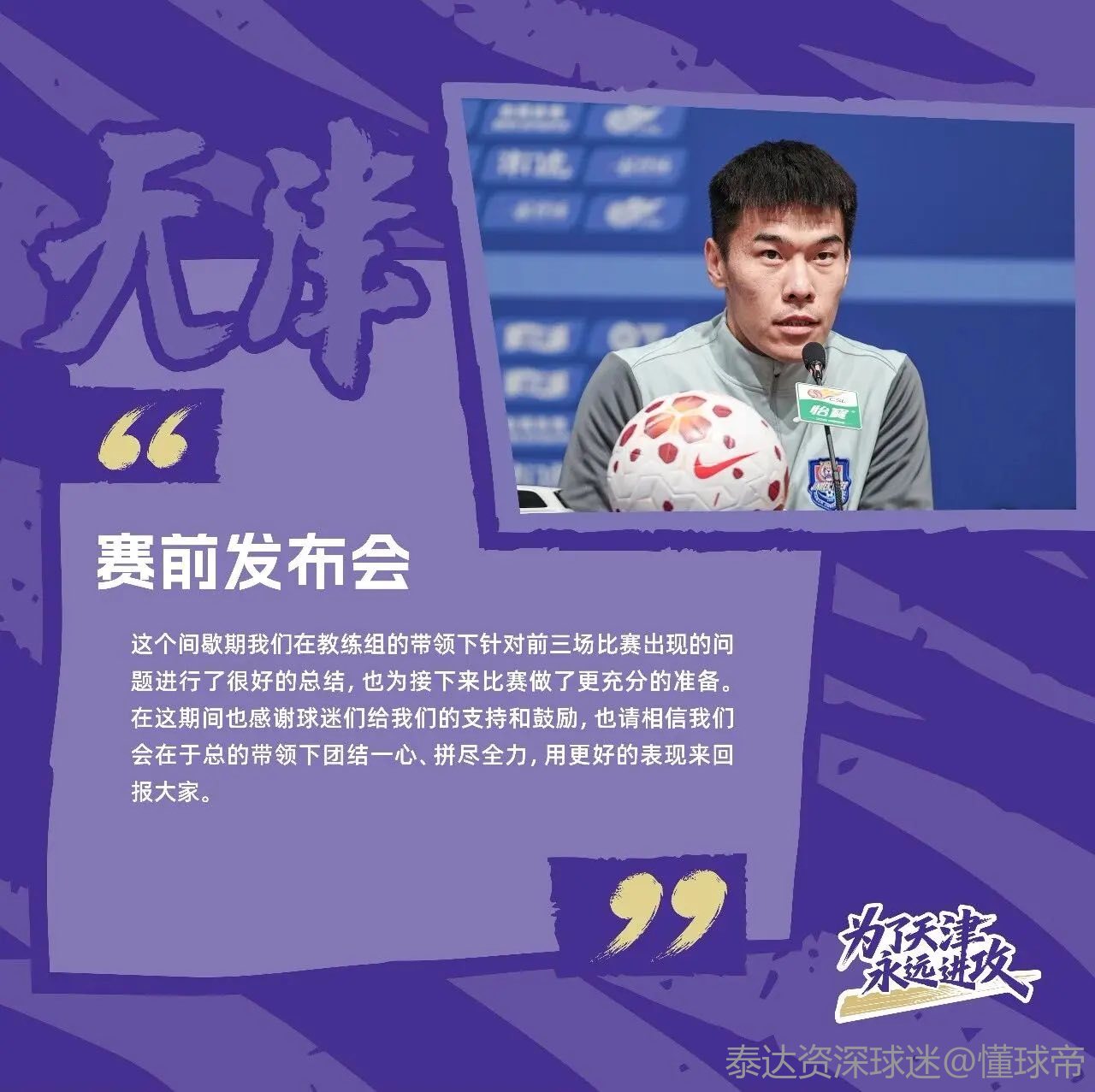 于根伟:“这两周训练不错,球队除了做好前三场总结之外也有了很好的训练准备。大家非常团结,很有凝聚力,我们都知道目前的处境,明天会全力以赴集中在比赛中,希望我们有好的发挥和表现,收获一个好的结果。”
