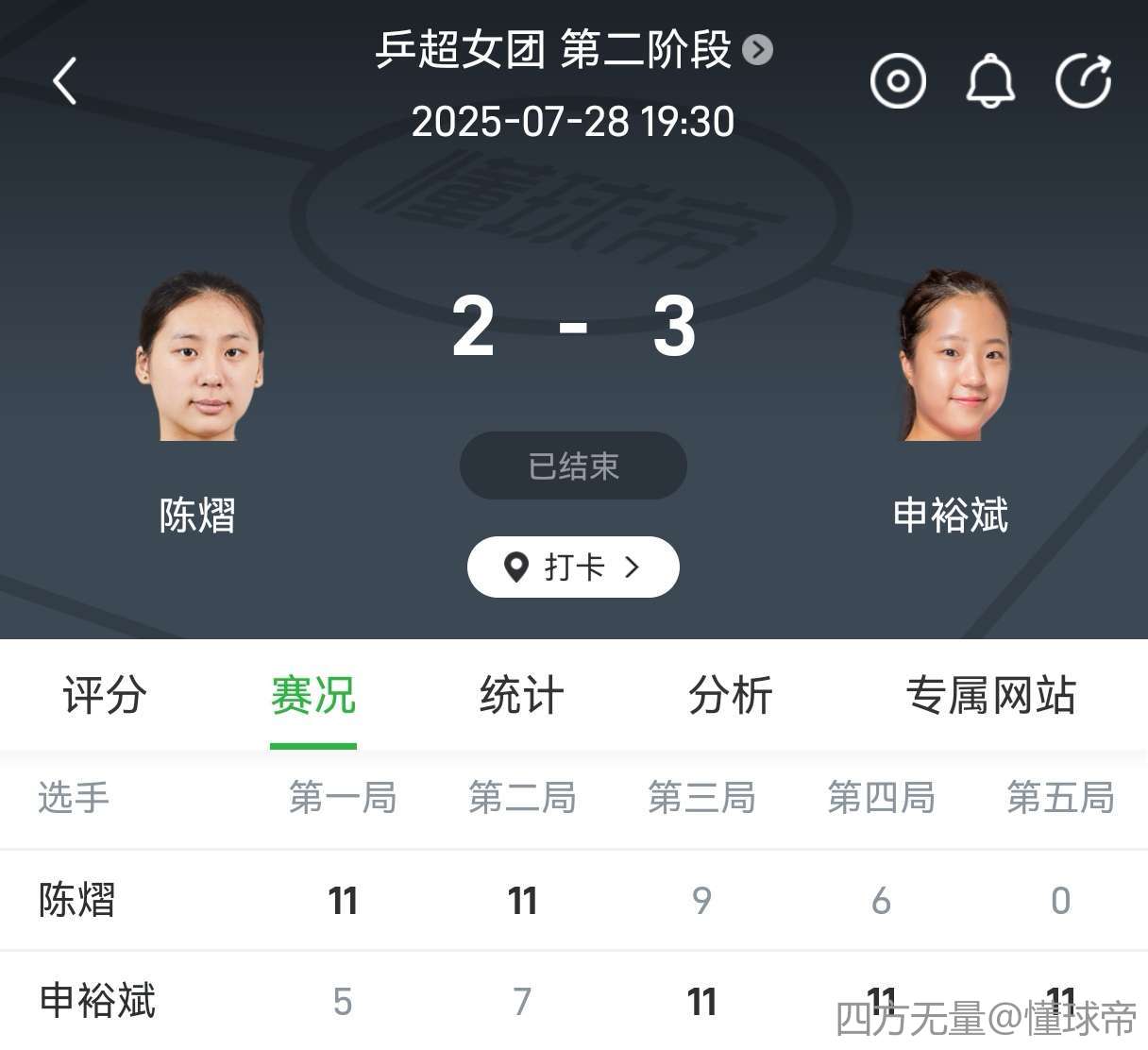 11:0这个比分在去年的乒超比赛中也有记载,而且也是申裕斌面对一位陈姓国乒选手打出来的