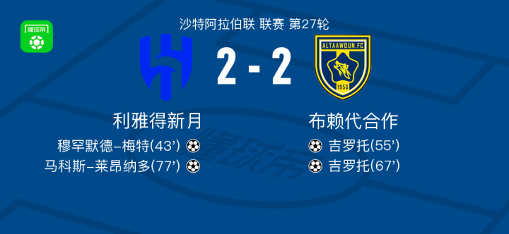 北京时间4月5日沙特阿拉伯联 联赛 第27轮,利雅得新月主场对阵布赖代合作。利雅得新月穆罕默德-梅特破门,马科斯-莱昂纳多破门。布赖代合作吉罗托梅开二度。最终比分利雅得新月 2-2 布赖代合作。