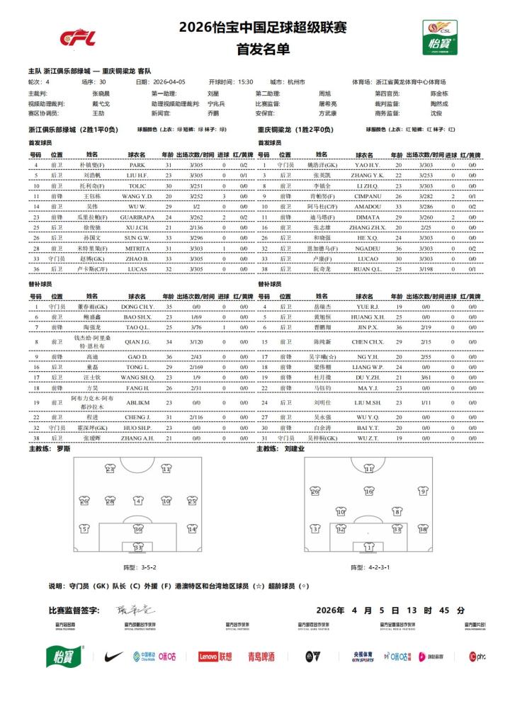 北京时间4月5日15:30,中超第4轮焦点战,浙江坐镇黄龙体育中心体育场迎战重庆铜梁龙,本场主裁判为张晓晨,VAR裁判为戴弋戈,赛前双方首发出炉。