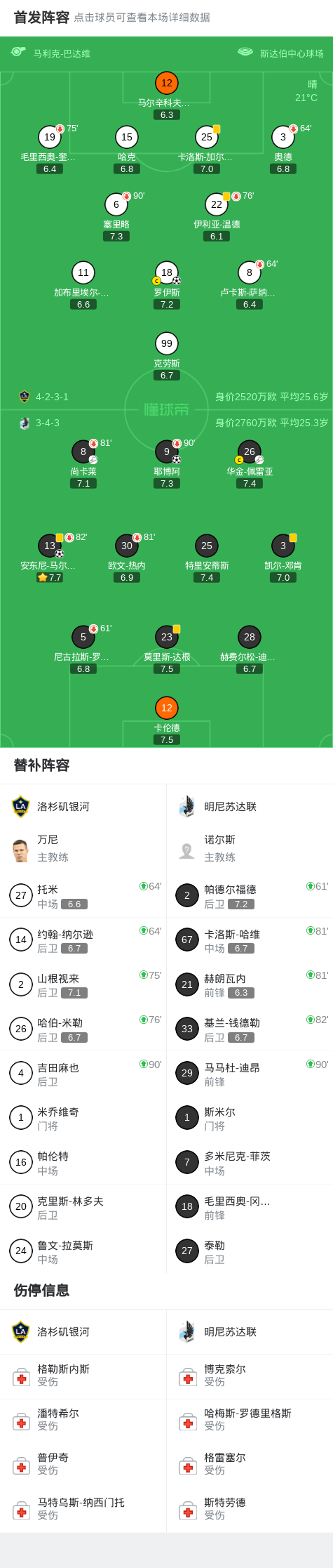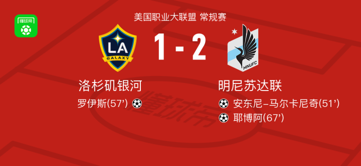 北京时间4月5日美国职业大联盟 常规赛,洛杉矶银河主场对阵明尼苏达联。洛杉矶银河罗伊斯破门。明尼苏达联安东尼-马尔卡尼奇破门,耶博阿破门。最终比分洛杉矶银河 1-2 明尼苏达联。