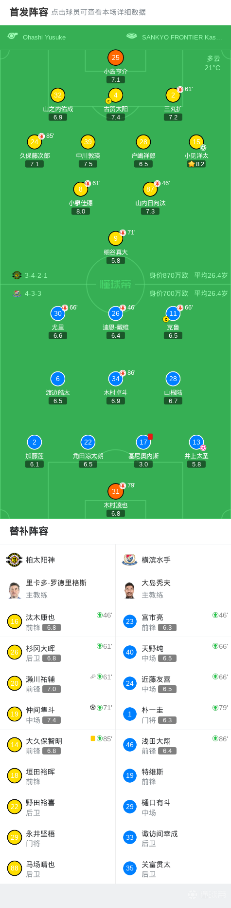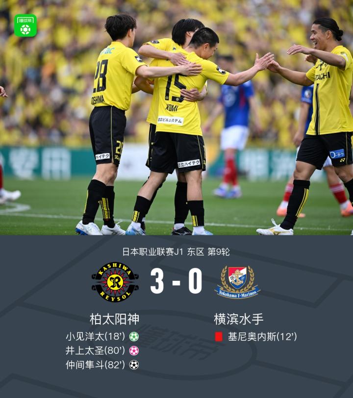 北京时间4月5日日本职业联赛J1东区第9轮,柏太阳神主场对阵横滨水手。基尼奥内斯染红,小见洋太点射破门,仲间隼斗建功,井上太圣自摆乌龙。最终比分柏太阳神3-0横滨水手。