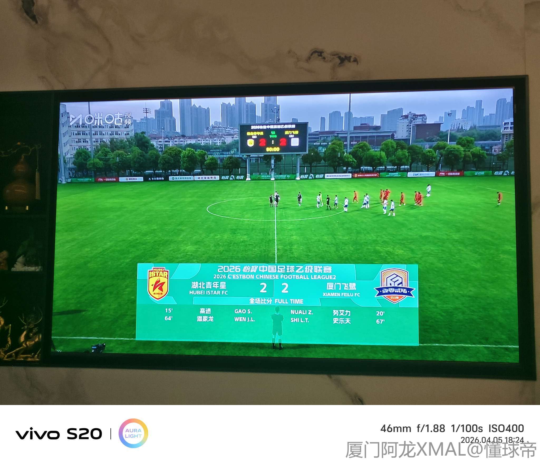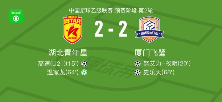 北京时间4月5日中国足球乙级联赛 预赛阶段 第2轮,湖北青年星主场对阵厦门飞鹭。湖北青年星高速破门,温家龙破门。厦门飞鹭努艾力-孜明破门,史乐天破门。最终比分湖北青年星 2-2 厦门飞鹭。