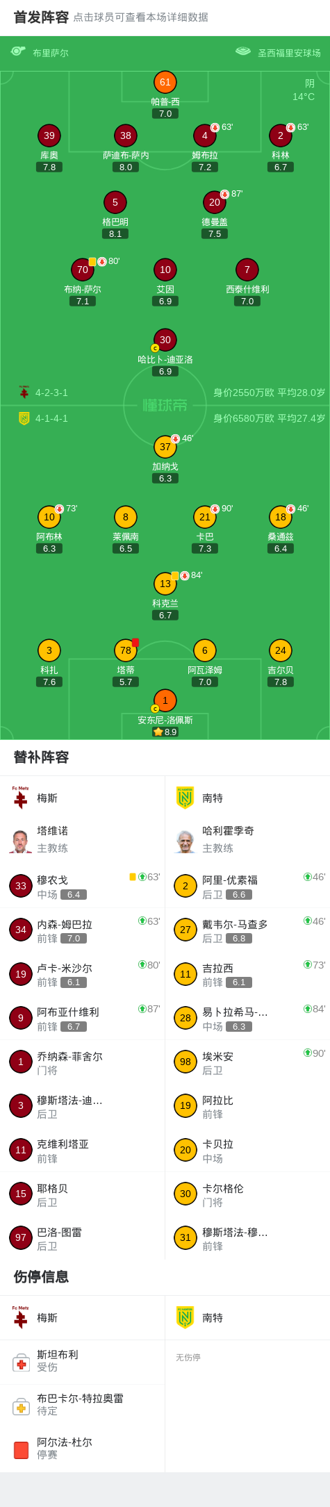 北京时间4月5日法国足球顶级联赛 联赛 第28轮,梅斯主场对阵南特。最终比分梅斯 0-0 南特。