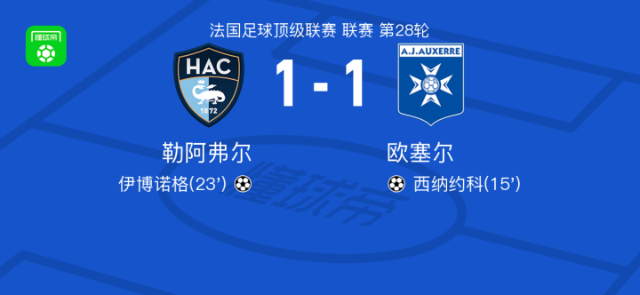 北京时间4月5日法国足球顶级联赛 联赛 第28轮,勒阿弗尔主场对阵欧塞尔。勒阿弗尔伊博诺格破门。欧塞尔西纳约科破门。最终比分勒阿弗尔 1-1 欧塞尔。