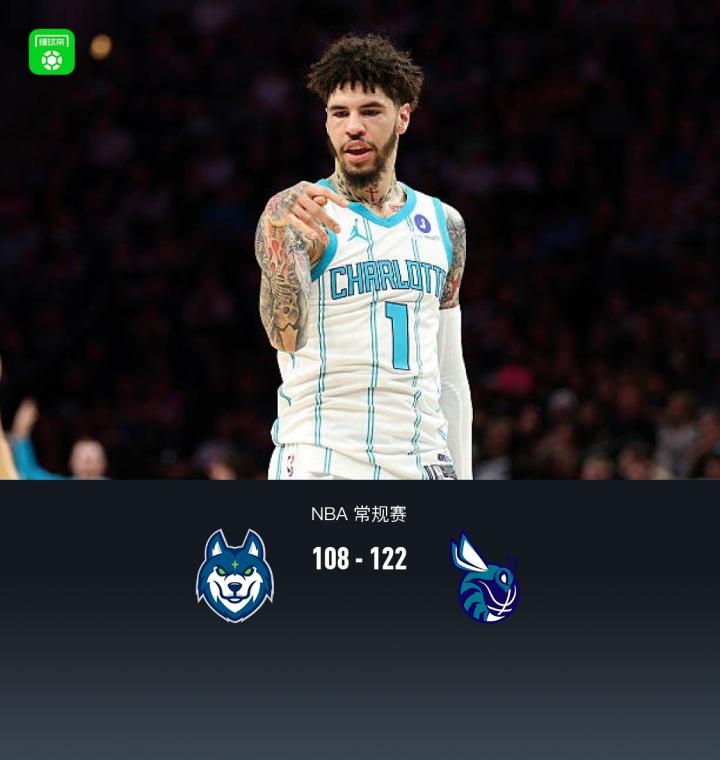 第四节森林狼杰伦-克拉克拿下6分,黄蜂拉梅洛-鲍尔拿下10分,最终森林狼108-122不敌黄蜂