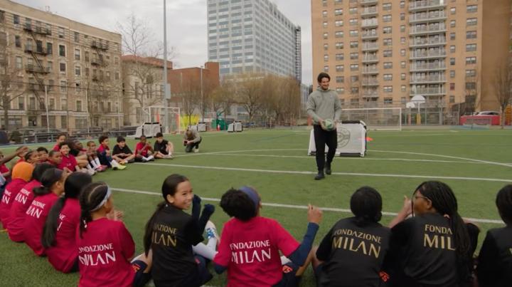 我能看出来,你真的太爱这项运动了。我们这儿正好有一件AC米兰球衣,后面那群孩子也都在踢球。我觉得可以把这件球衣送给其中一个孩子。