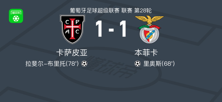 北京时间4月7日葡萄牙足球超级联赛 联赛 第28轮,卡萨皮亚主场对阵本菲卡。卡萨皮亚拉斐尔-布里托破门。本菲卡里奥斯破门。最终比分卡萨皮亚 1-1 本菲卡。