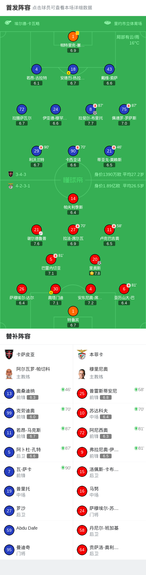 卡萨皮亚1-1本菲卡,里奥斯首开记录,拉斐尔-布里托扳平比分