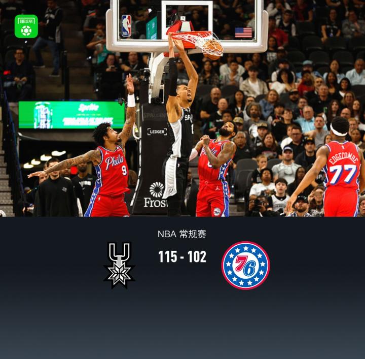 第四节马刺迪伦-哈珀拿下5分,76人马克西拿下8分,最终马刺115-102战胜76人
